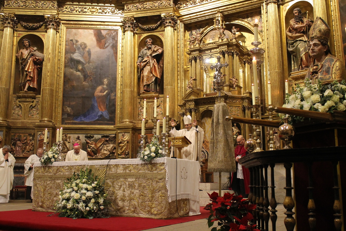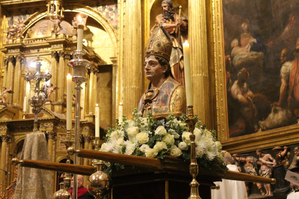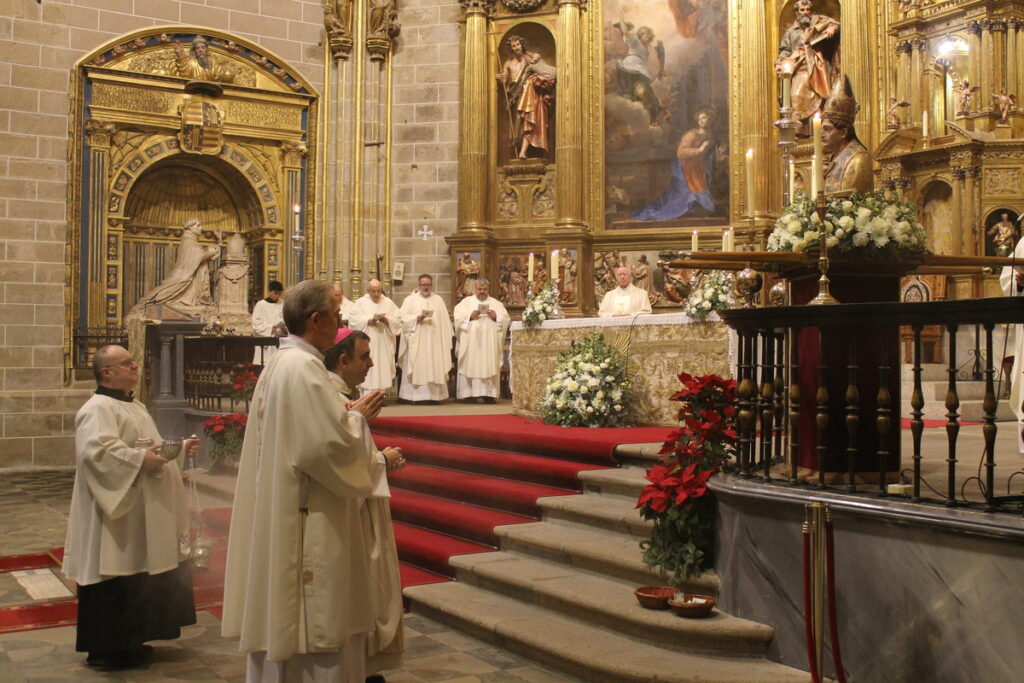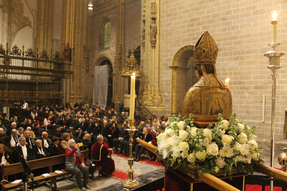 Tras la tradicional procesión por el Claustro de la Catedral se procedió a la Eucaristía. En su homilía, Monseñor Brotóns ensalzó la figura del patrón, «un hombre bueno con corazón de pastor, famoso por su sabiduría, buen juicio y santidad. Un auténtico testigo de la fe», llamando a los que tienen responsabilidad en la Iglesia a seguir esos pasos del Buen Pastor, para reunir a su rebaño y «buscar a la oveja perdida Para sanar a la herida. Cada oveja cuenta. Con cada oveja se establece un vínculo de compasión, comunión y amor», añadía.