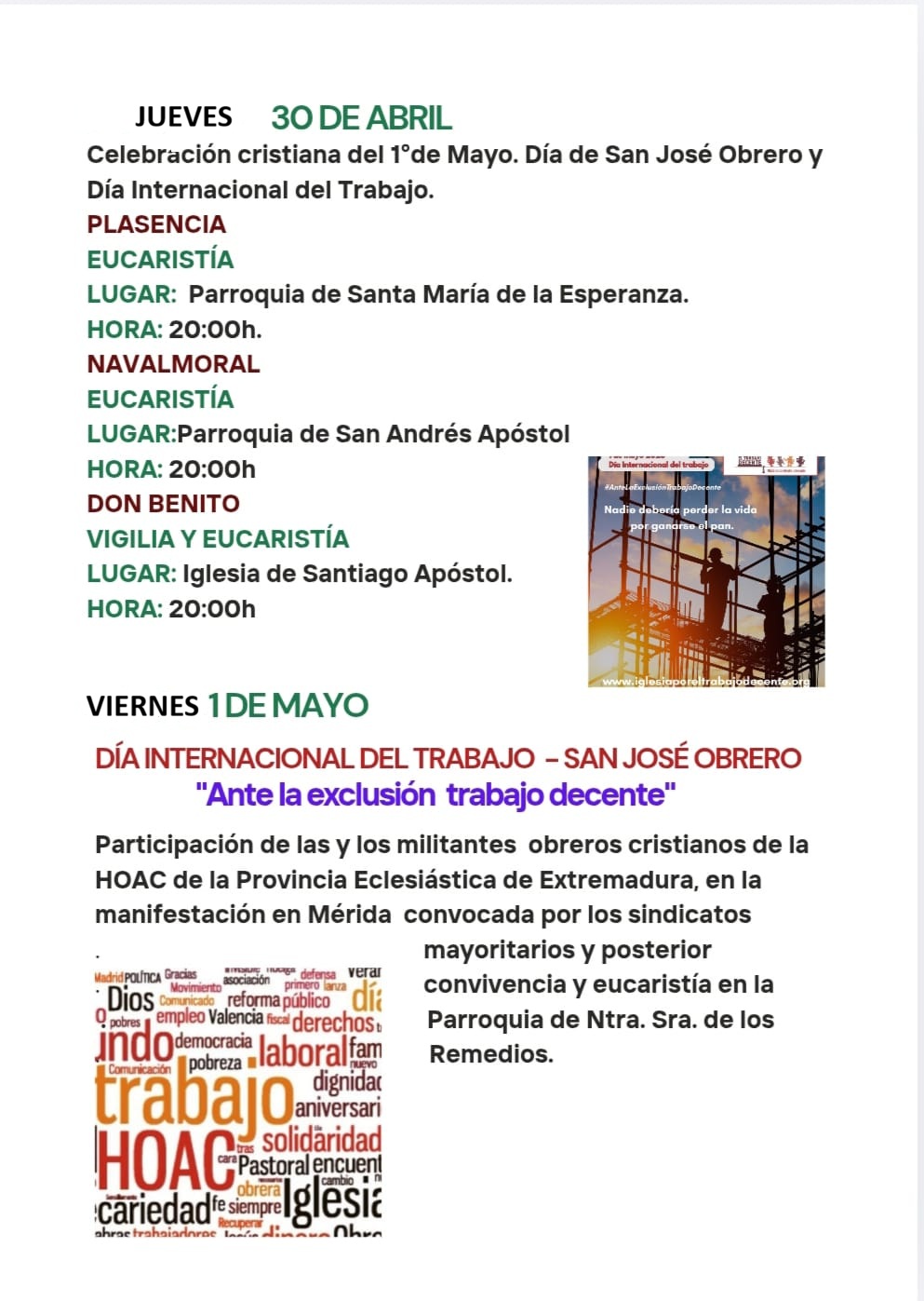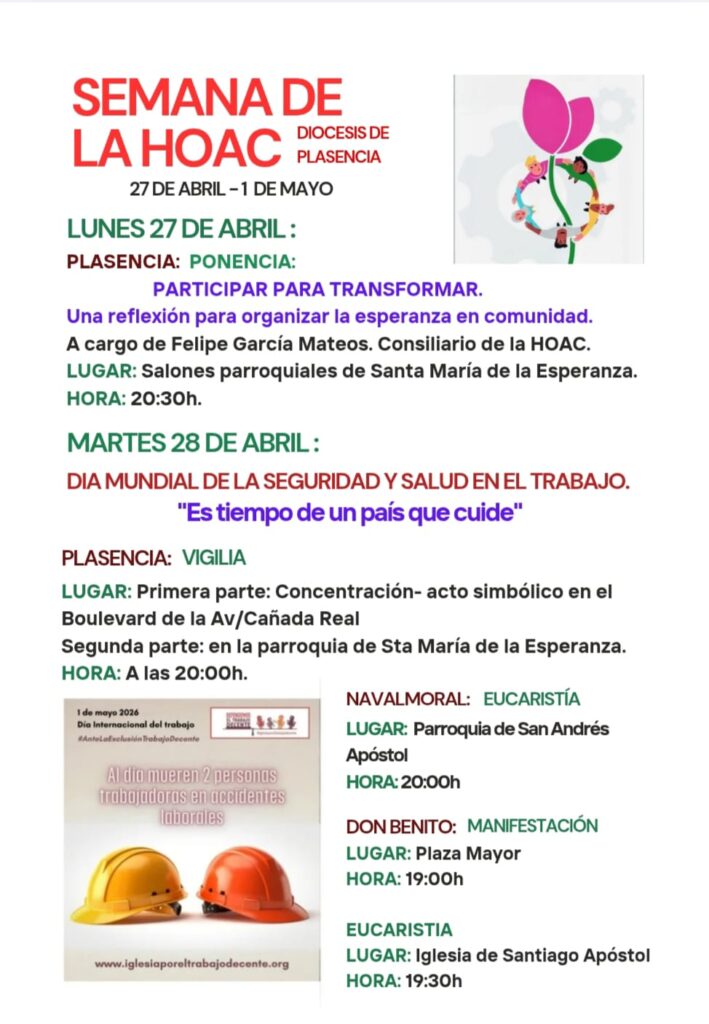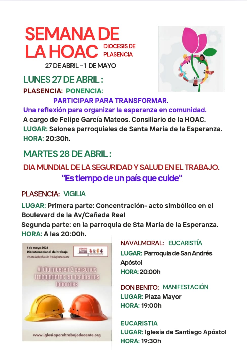 A partir del próximo lunes, 27 de abril, se celebra en nuestra diócesis la Semana de la delegación placentina de la Hermandad Obrera de Acción Católica, que presenta un intenso programa coincidiendo con el Día Mundial de la Seguridad y Salud en el Trabajo (28 de abril) y que culminará con la celebración del Día Internacional del Trabajo en la festividad de San José Obrero el 1 de mayo.