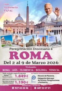 Bajo la organización de la Delegación Episcopal de Turismo, Peregrinación y Santuarios de la Diócesis, del 2 al 9 de marzo se desarrollará la Peregrinación Diocesana a Roma, con Audiencia Papal y en régimen de pensión completa y el precio es de 1.849 euros. El viaje incluye la visita a las ciudades de Roma, Asís, Florencia, Bolonia y Venecia.