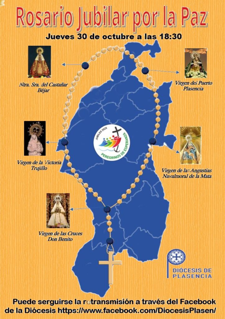 Con motivo del mes del Santo Rosario, nuestra diócesis vivirá este próximo jueves, 30 de octubre, un día muy especial, con un Rosario por la Paz a las 18.30 desde las cinco ermitas/santuarios marianos, conectando a través del FaceBook diocesano. Siguiendo así la propuesta e invitación del Santo Padre León XIV, y en el contexto del año Jubilar, se irán haciendo públicos los misterios en cada uno de los templos con el siguiente orden previsto empezando y terminando en el Santuario del Puerto de Plasencia, donde presidirá nuestro Obispo, Monseñor don Ernesto J. Brotóns: