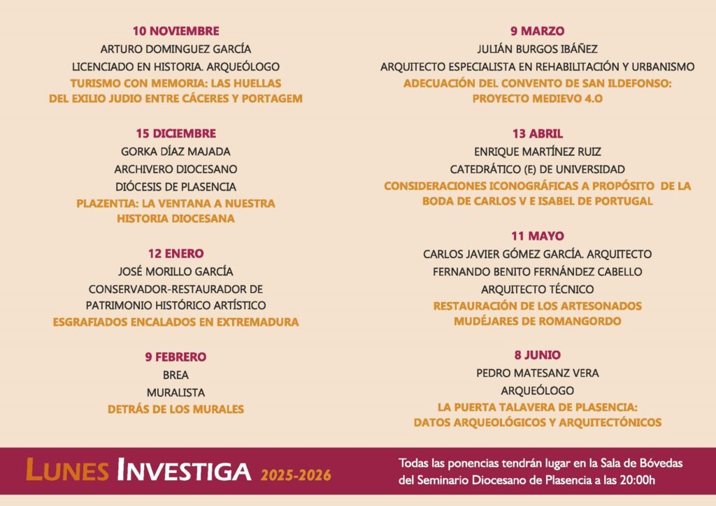Investigación, religión, cultura, patrimonio o historia son algunos de los ámbitos que se conjugan en los Lunes Investiga, uno de los grandes referentes culturales y patrimoniales de Plasencia consolidado tras siete ediciones desarrolladas con enorme éxito. El ciclo está organizado por la Delegación Diocesana de Patrimonio bajo la batuta de la delegada, Mercedes Orantos Sánchez-Rodrigo, quien consigue mantener año tras año la estructura consiguiendo atraer la atención con distintas temáticas y ponentes. El objetivo es dar a conocer la investigación de autores ya consagrados y también dar la oportunidad a los jóvenes investigadores que comienzan su carrera profesional, de presentar públicamente el resultado de sus trabajos.