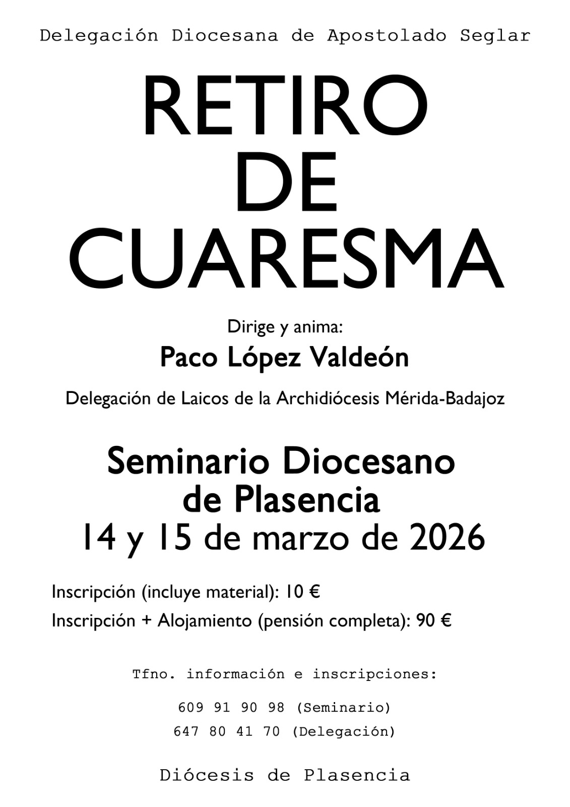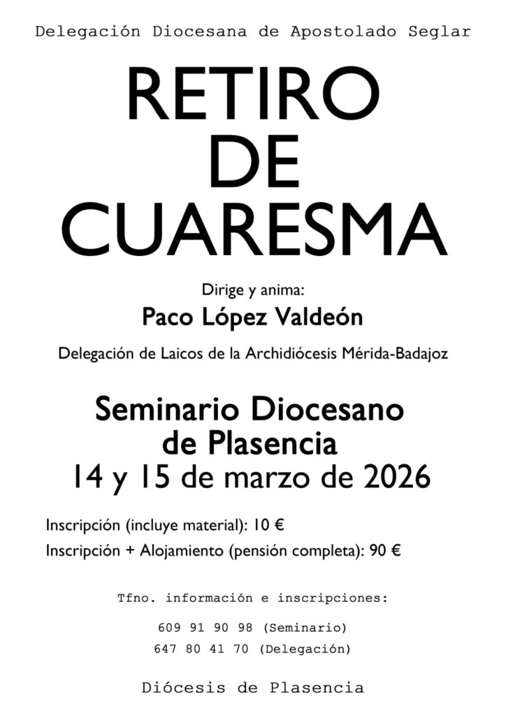 Todo está preparado para la celebración en los próximos fines de semana de los Retiros que organiza la Delegación diocesana de Apostolado Seglar. En esta ocasión, la principal novedad es que el de la zona norte se traslada, por motivos de agenda de la casa, de Cabezuela del Valle al Seminario Diocesano de Plasencia.