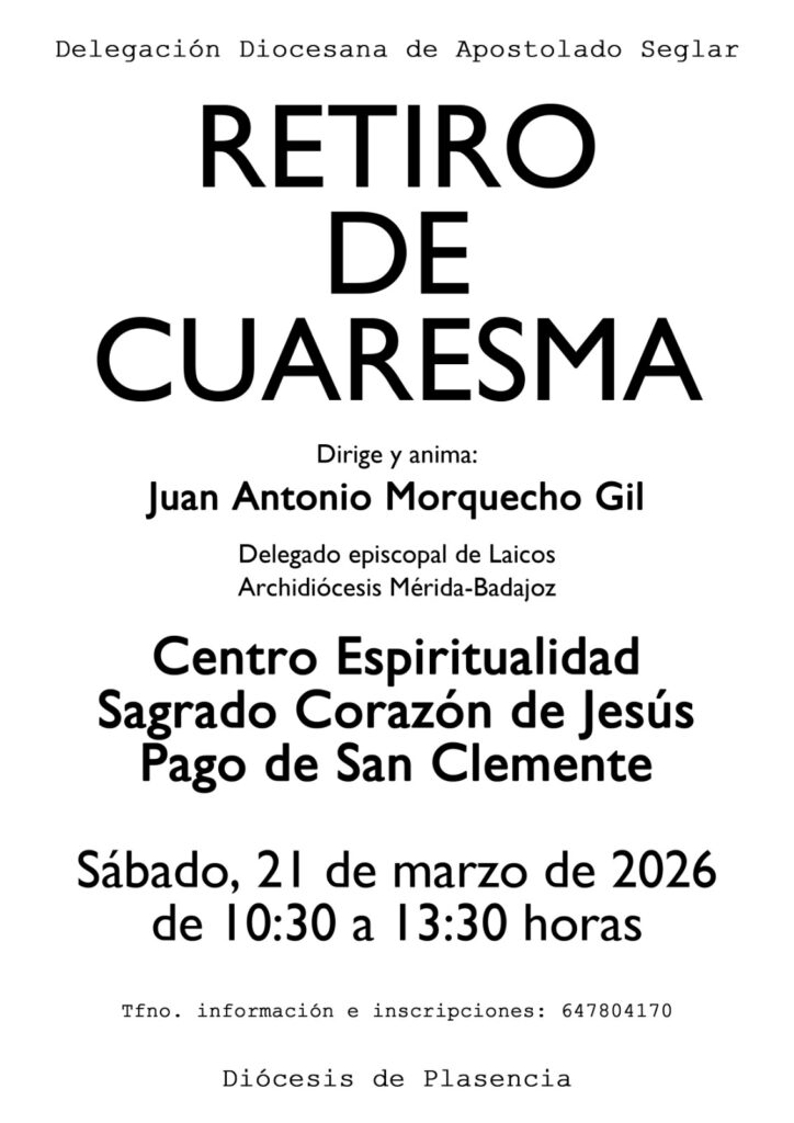 El retiro para la Zona Sur tendrá como animador a don Juan Antonio Morquecho Gil, delegado episcopal de Laicos de la Archidioócesis de Mérida Badajoz. Tendrá lugar el día 21 de marzo en el Centro de Espiritualidad del Sagrado Corazón de Jesús en Pago de San Clemente.